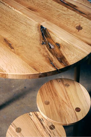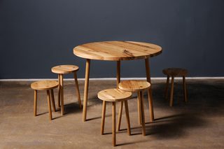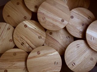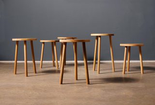 Unable to find a simple three-legged footstool, I decided to make one. The design was easy to manufacture, and from there I made several batches and versions — in different heights, with inlays, fumed, raw, treated. Varying-sized tables completed the set. Aside from copper and brass inlays, always in Oak.